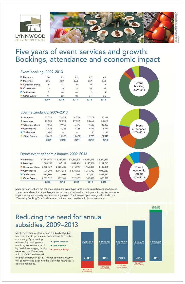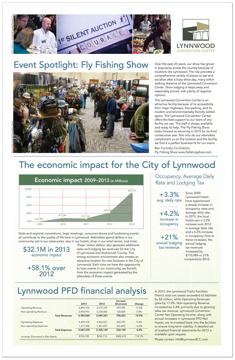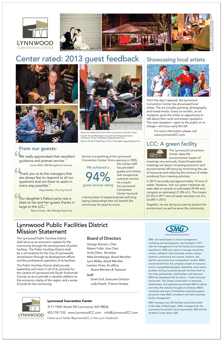 Tabloid-style, 4-page annual report designed for the Lynnwood Convention Center, Lynnwood, Washington