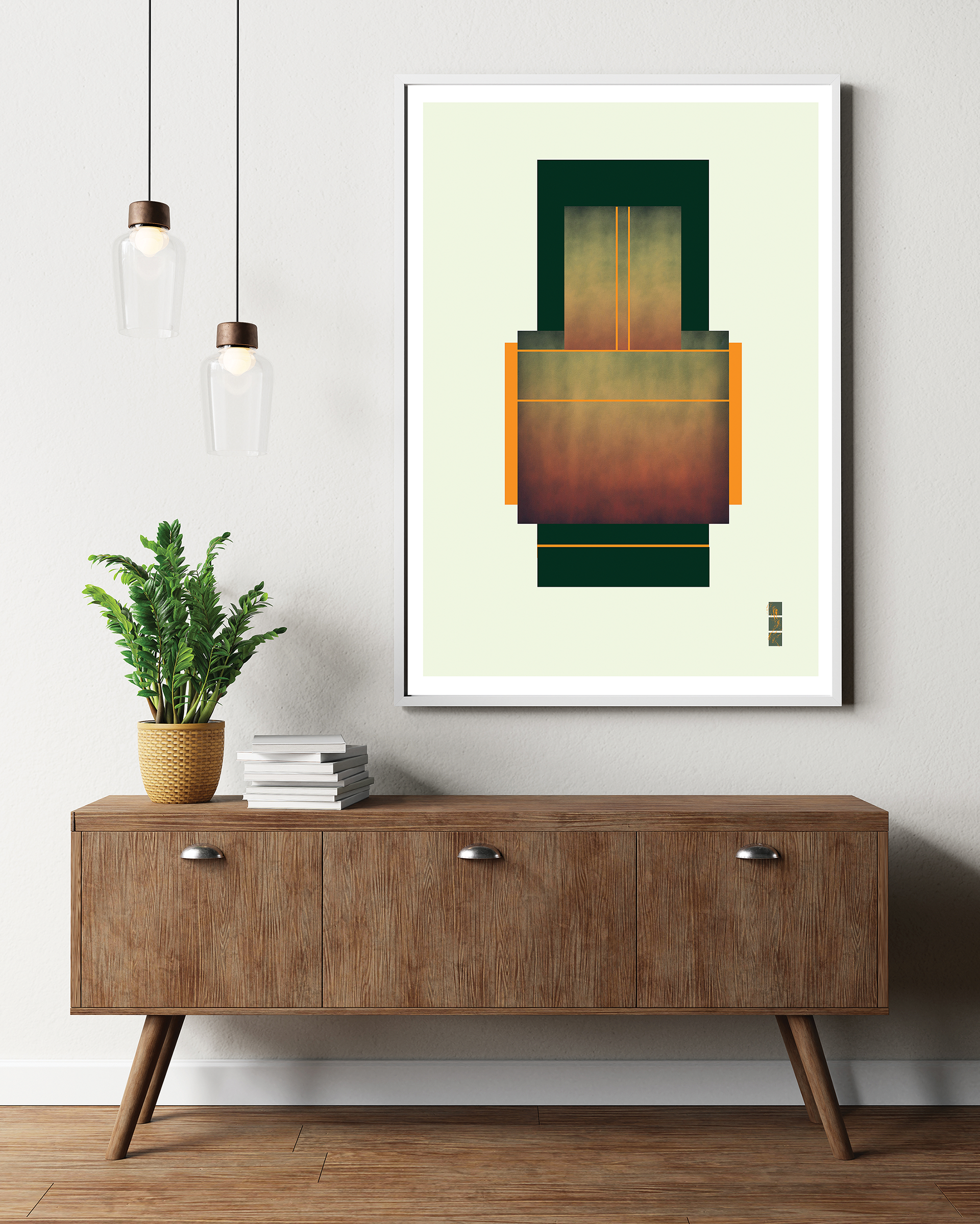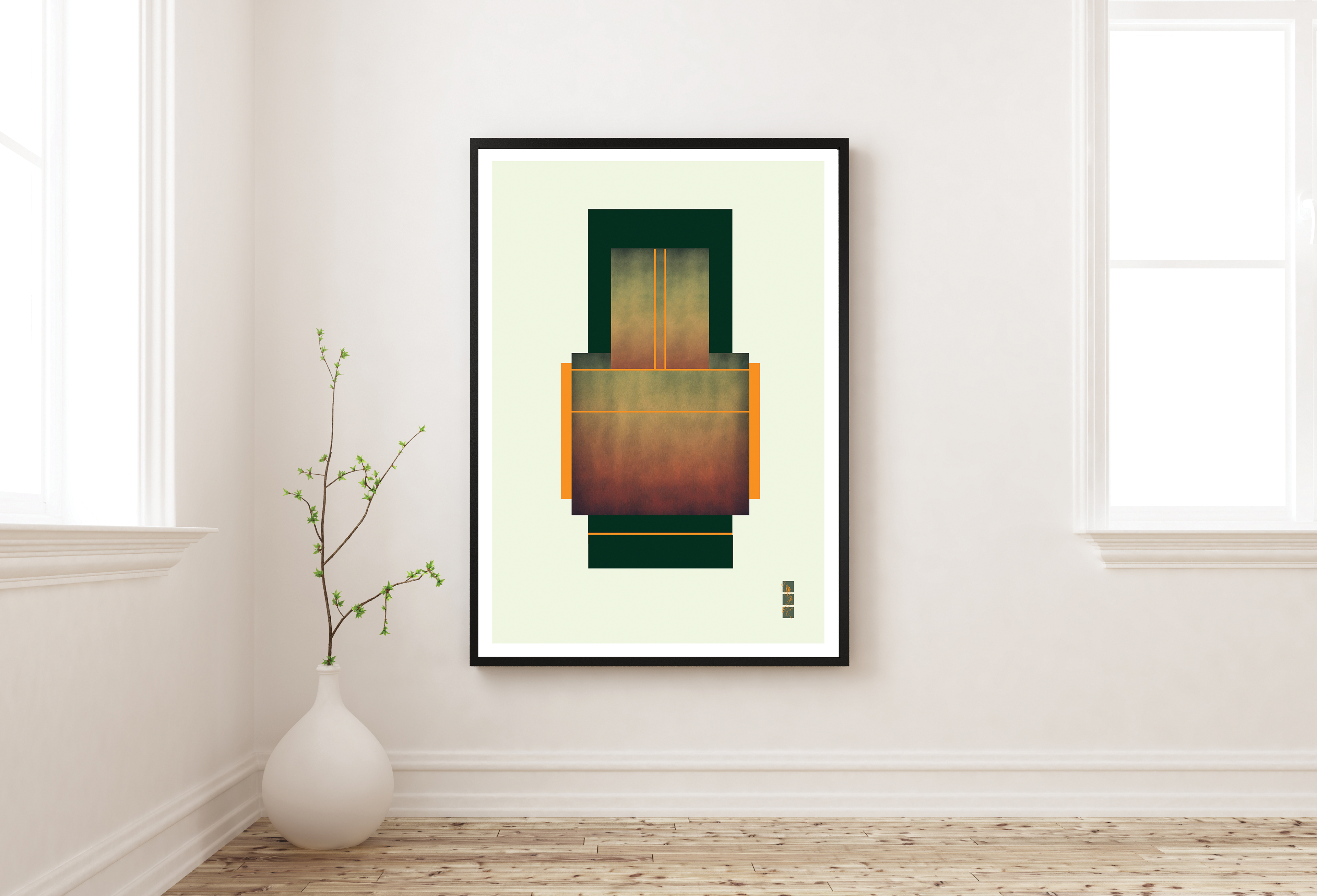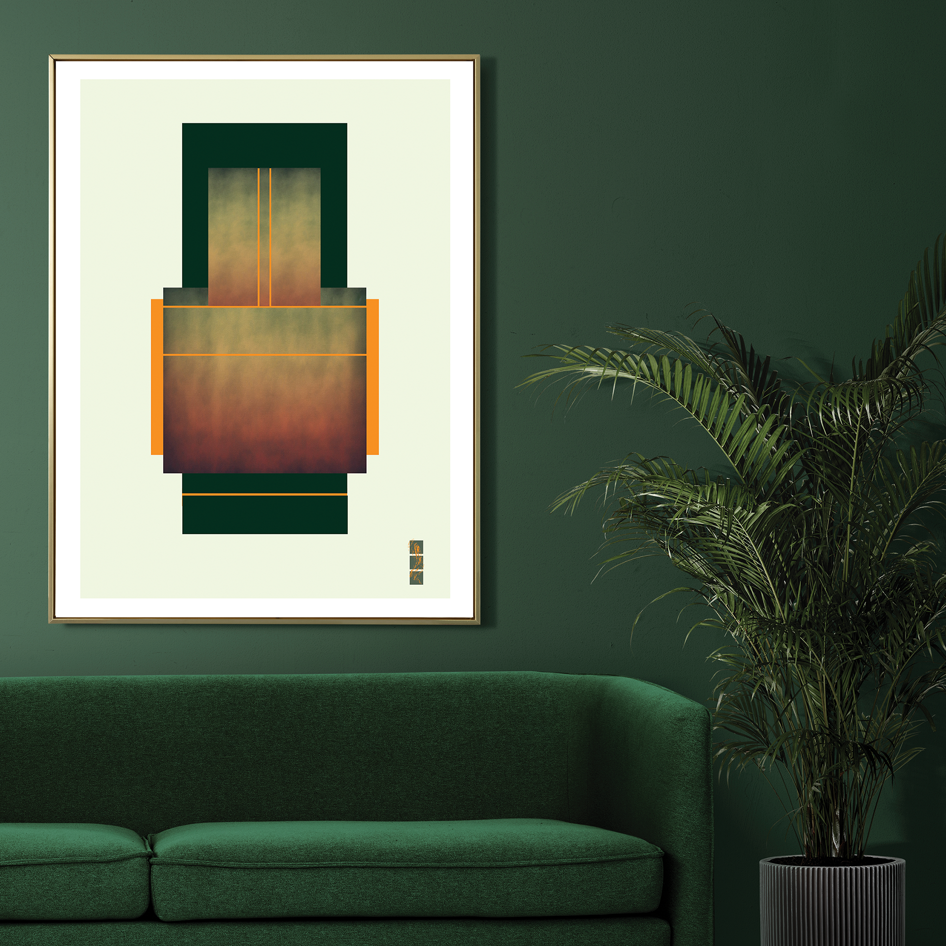 An abstract midcentury modernist autumnal color block print in textured greens, golds and reds. Prints, home decor, and related product available at: