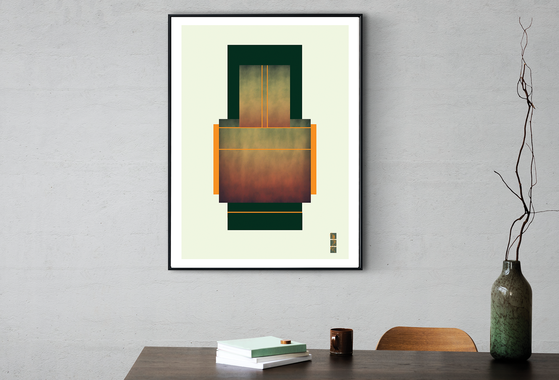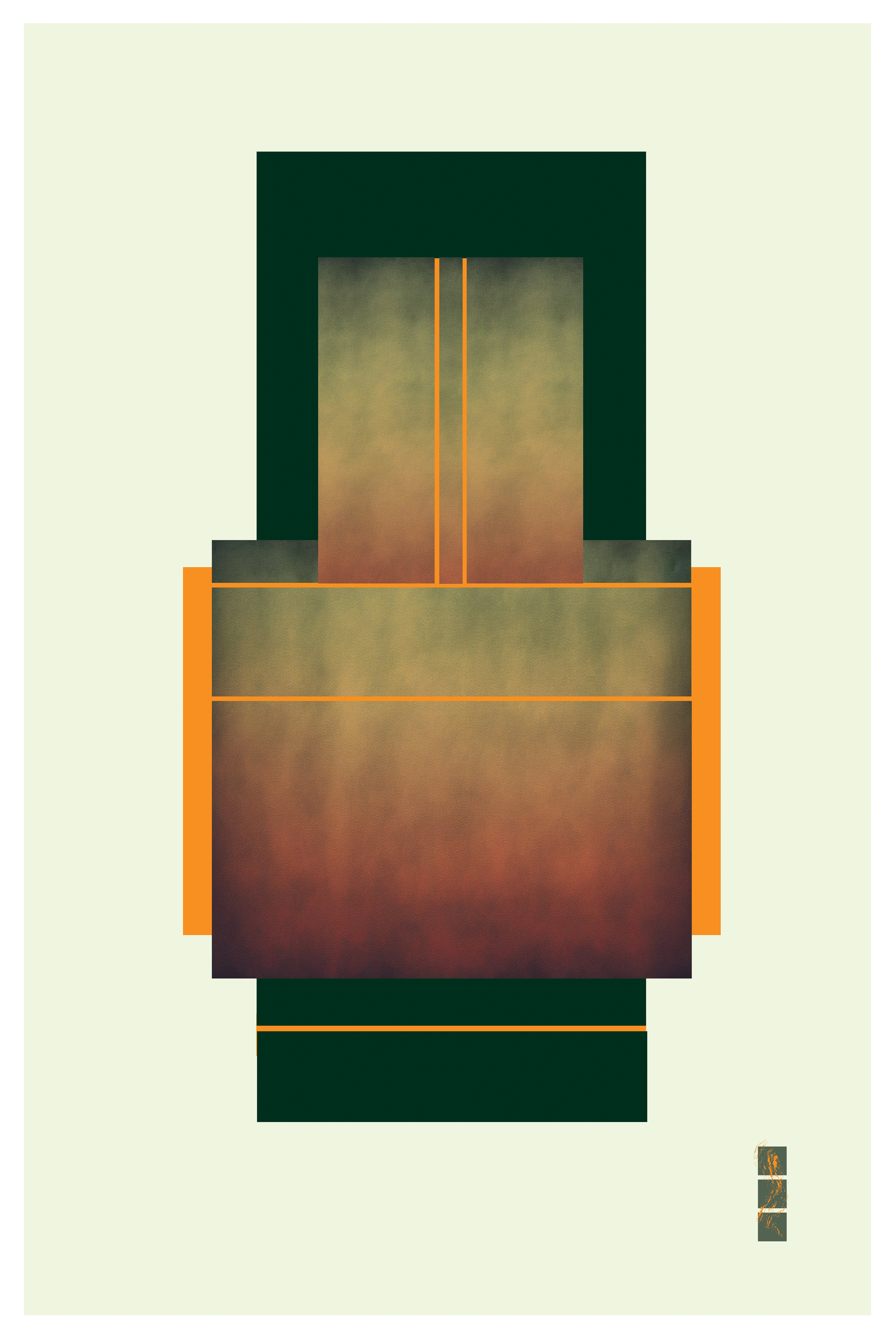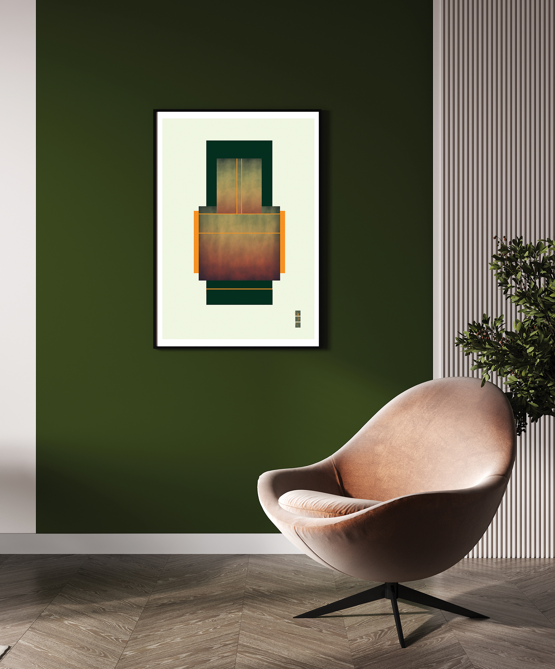 An abstract midcentury modernist autumnal color block print in textured greens, golds and reds. Prints, home decor, and related product available at:
