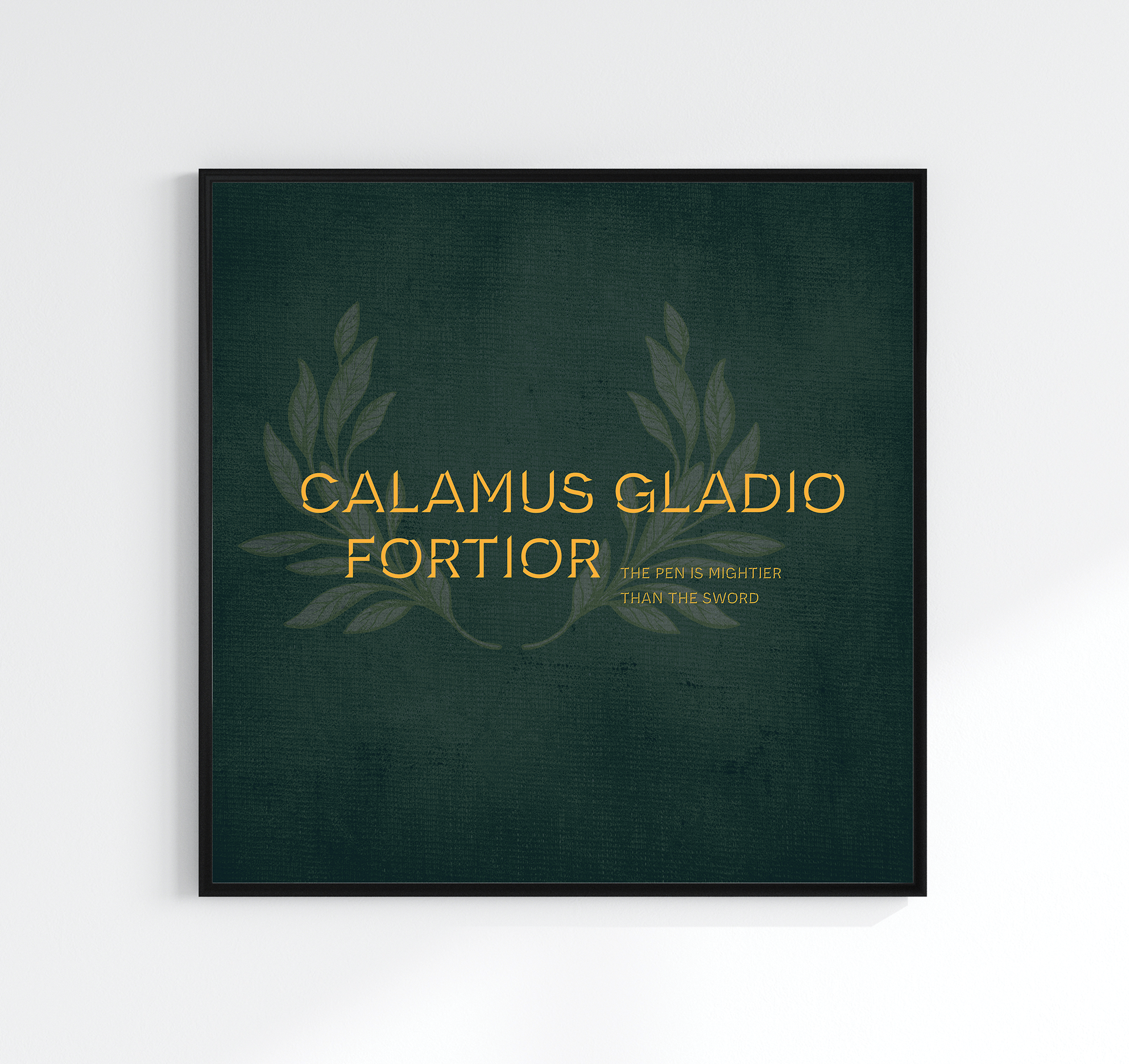 A selection from a fifteen-piece series of classic Latin maxims and aphorisms. Latin text and translations in golden type on textured, weathered field of teal blue.