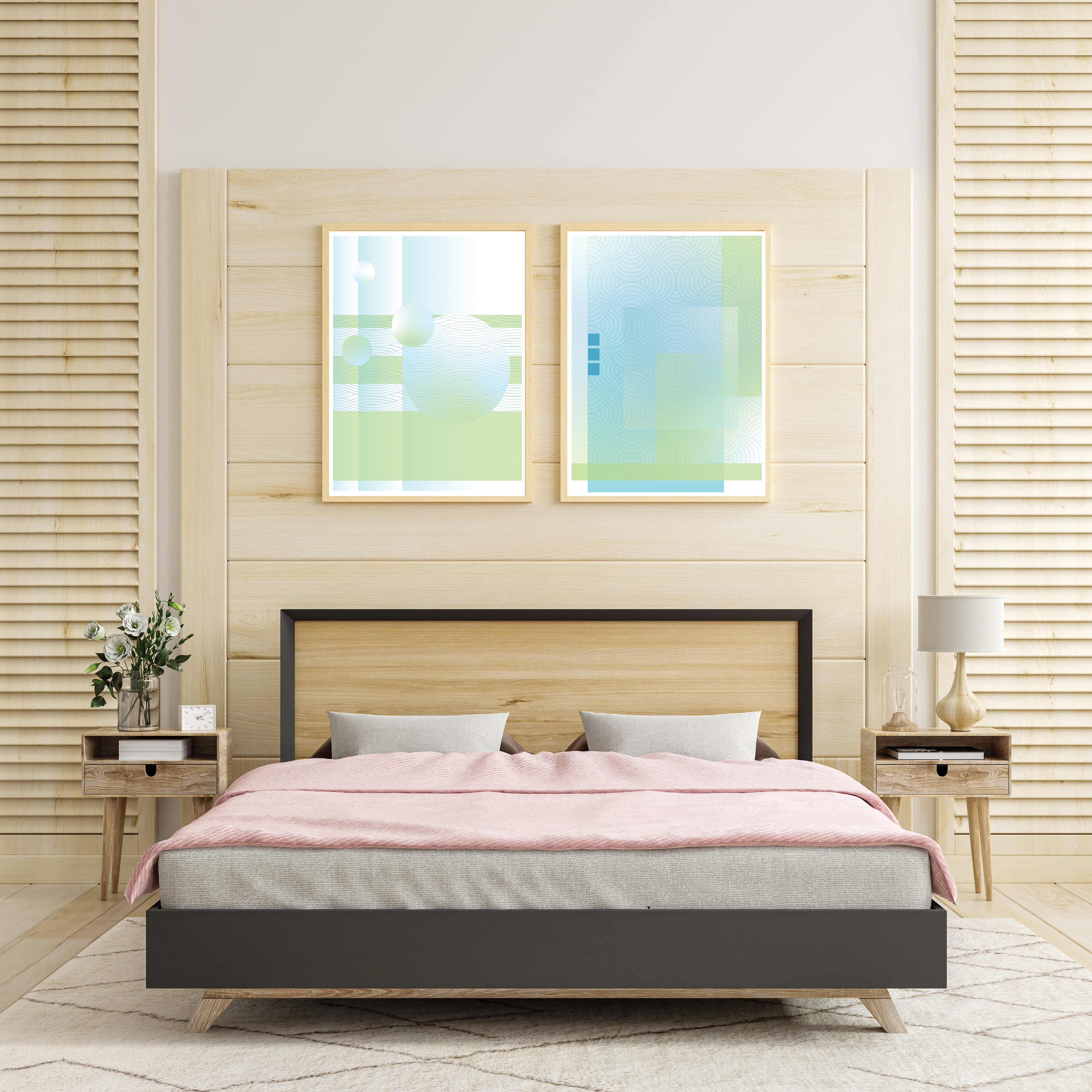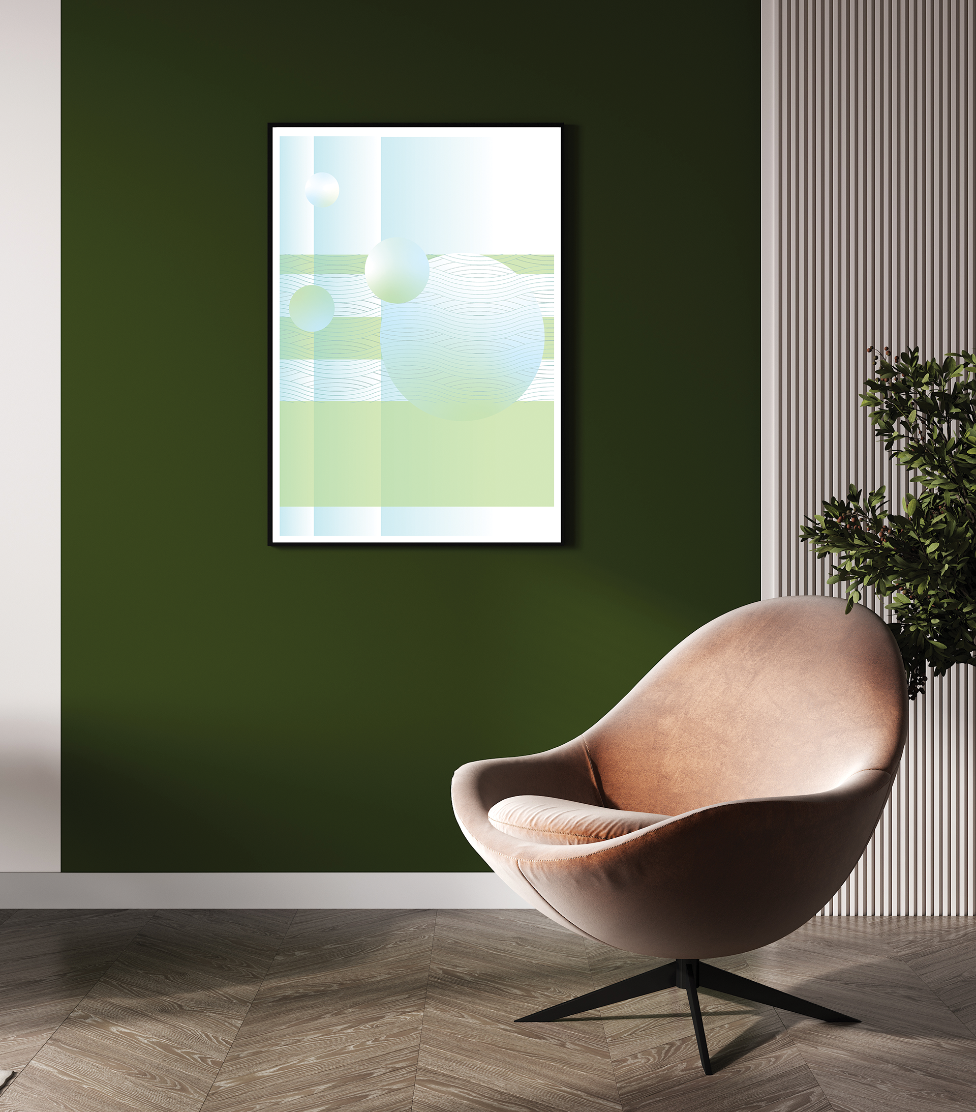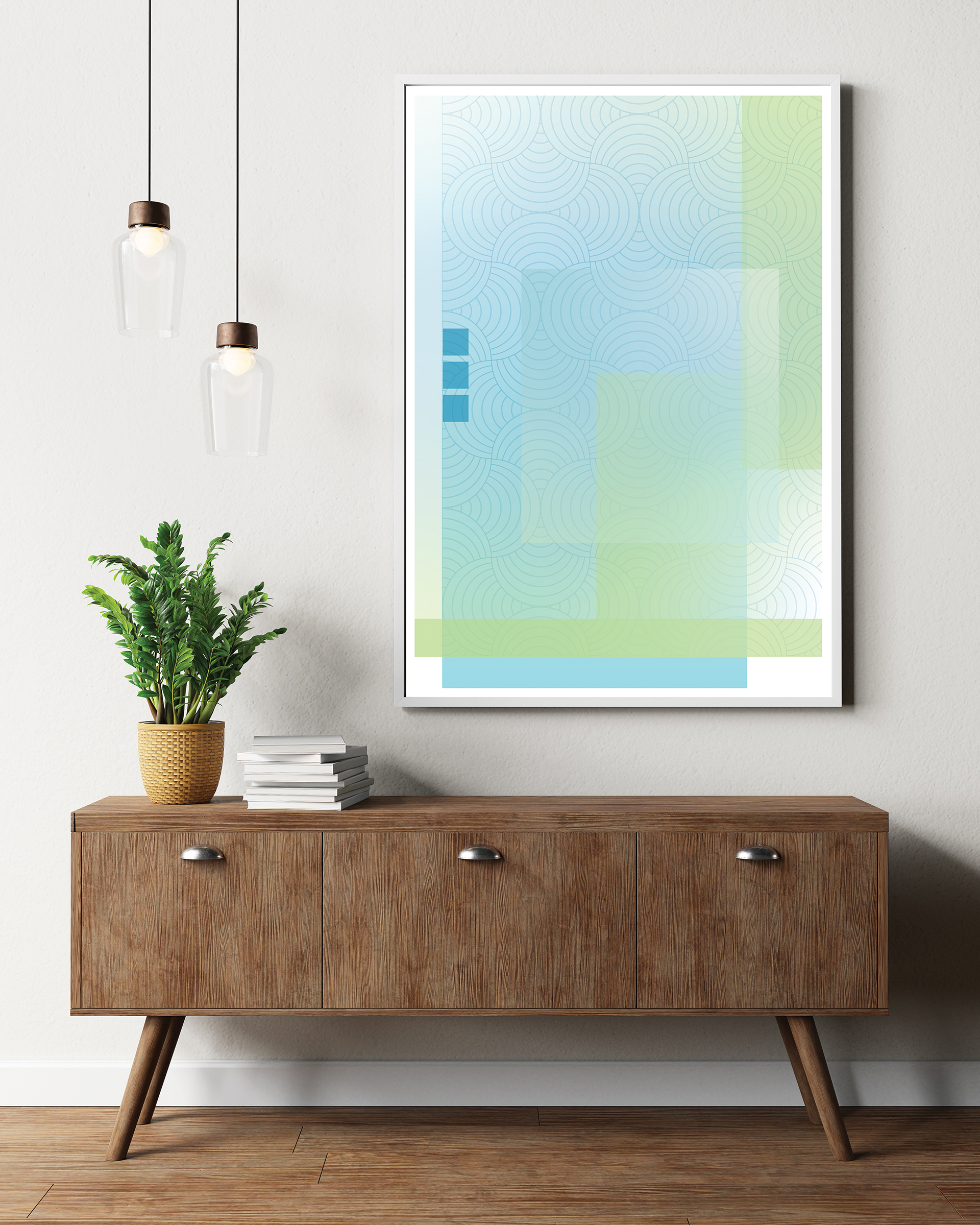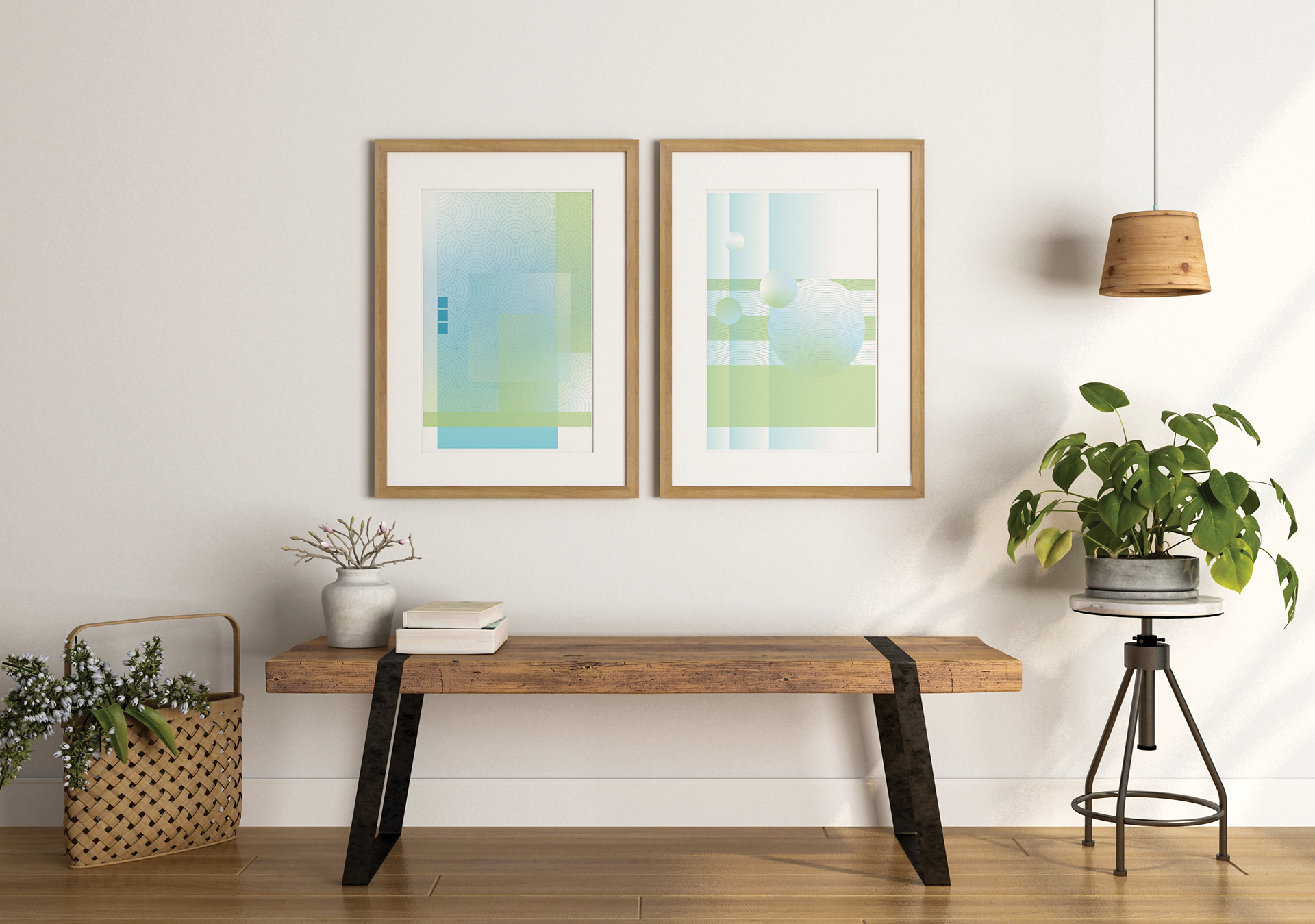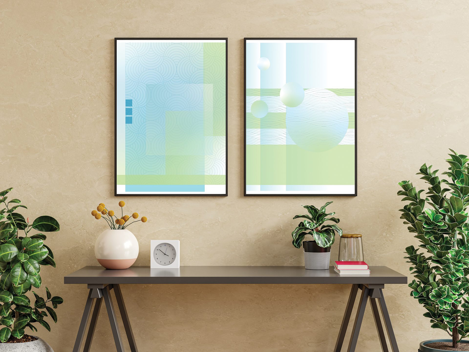 A pair of prints in gradient layers of abstract blues and greens. Prints, home decor, apparel and related product available at: