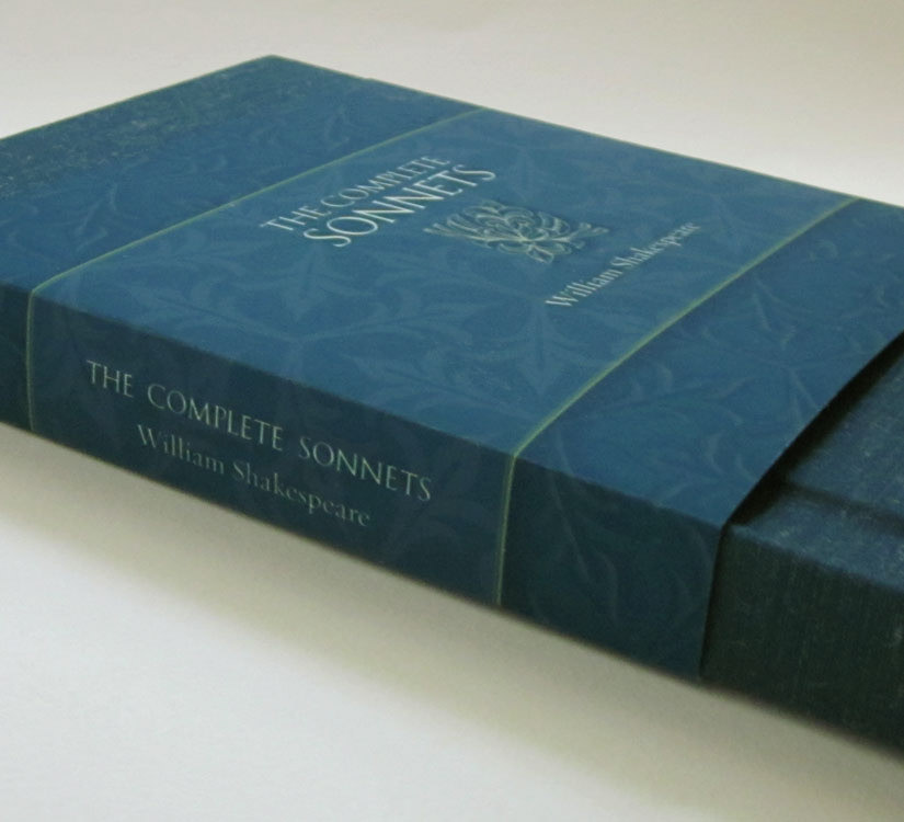 A fine edition of Shakespeare's 154 sonnets, limited to an edition of fifty numbered copies. This handmade book has a hand-sewn linen binding, ribbon bookmark, Japanese book cloth cover, and a protective title wrapper. Includes an index of first lines and colophon.