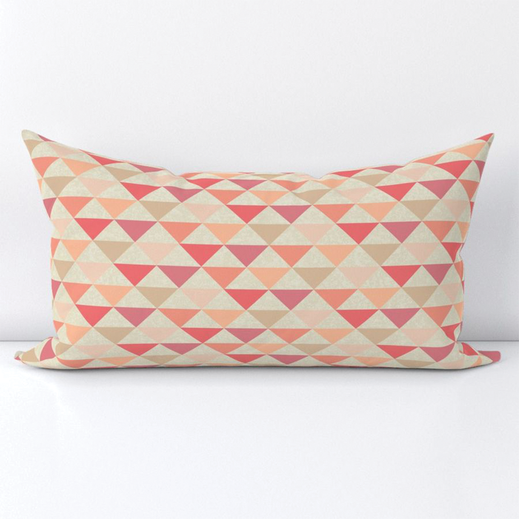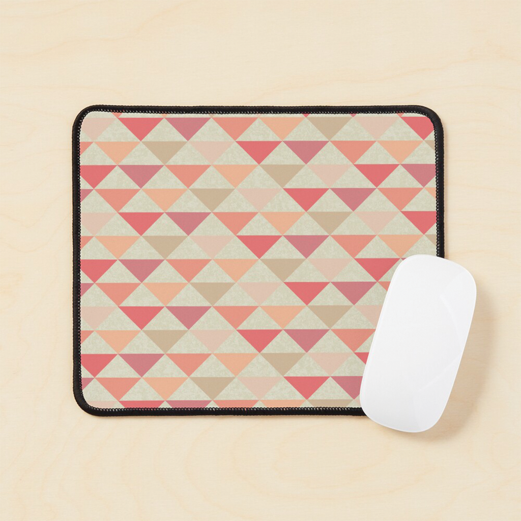 A geometric repeat pattern of mini triangles in shades of peach, pink, and taupe on a textured neutral field. A minimalist design for your décor and table.